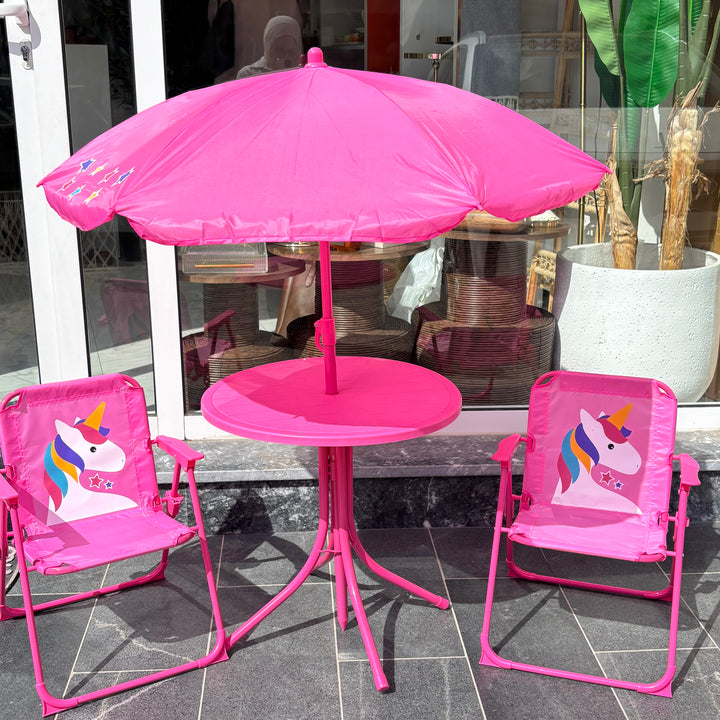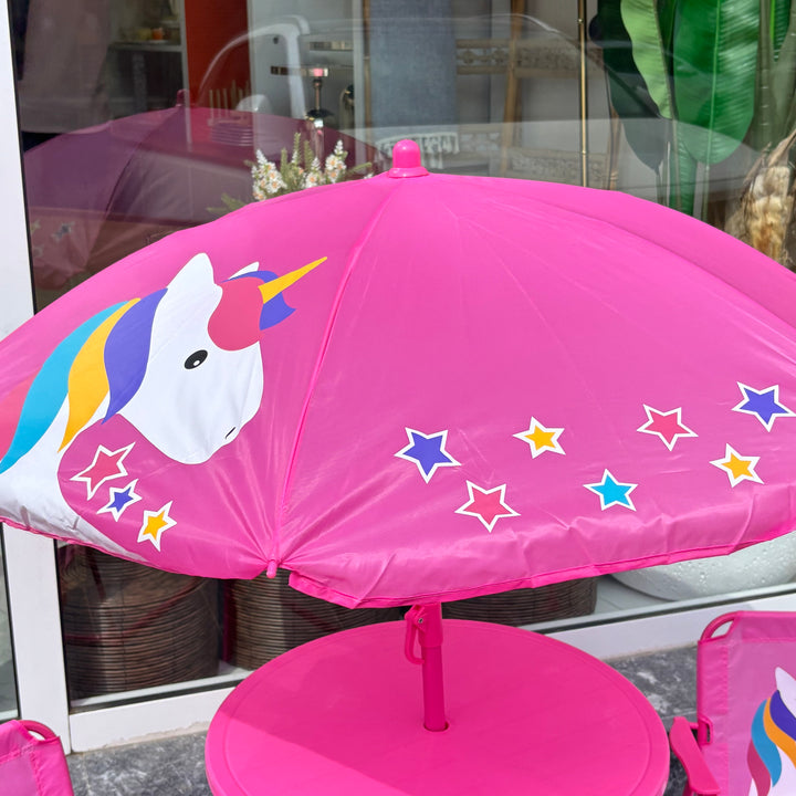 طاولة مع شمسيه وكرسيتين يونيكورن 🦄