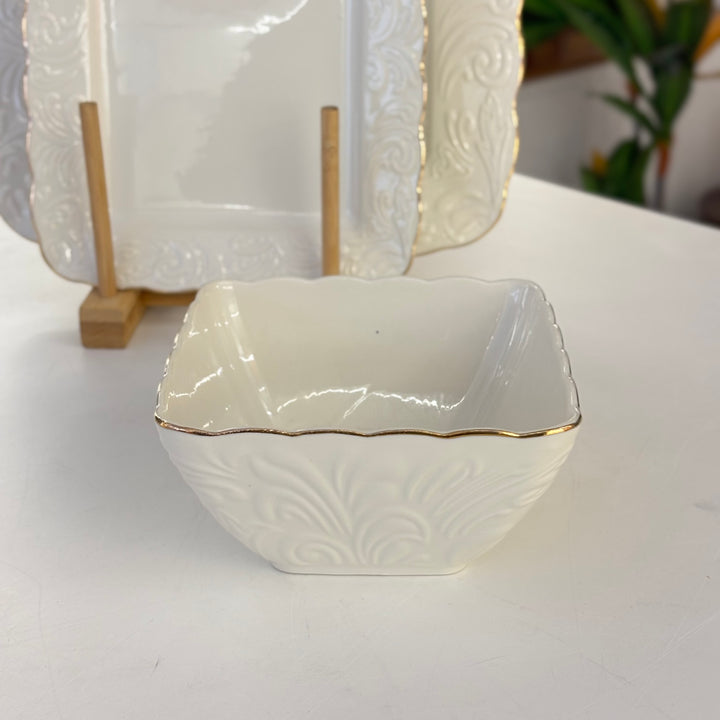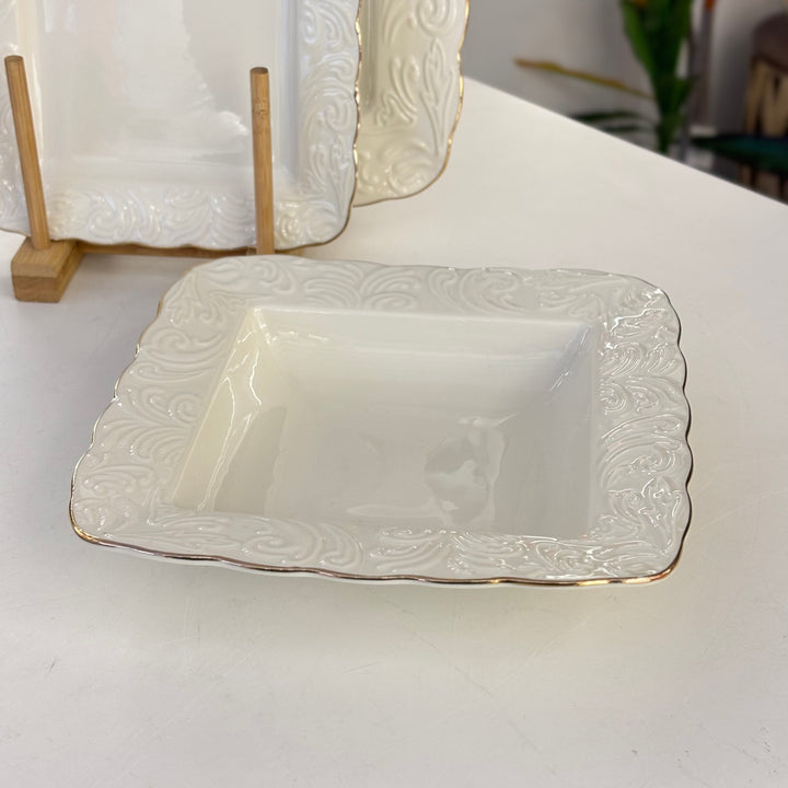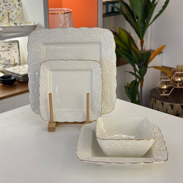 طقم سفرة 24 قطعة مزغرف مع حواف ذهبي مكفول ع الجلاية وبجودة عالمية مكون من : 6 صحون مسطح كبير مربع 6 صحون مسطح صغير مربع 6 صحون مجور مربع 6 صحون زبادي مربع