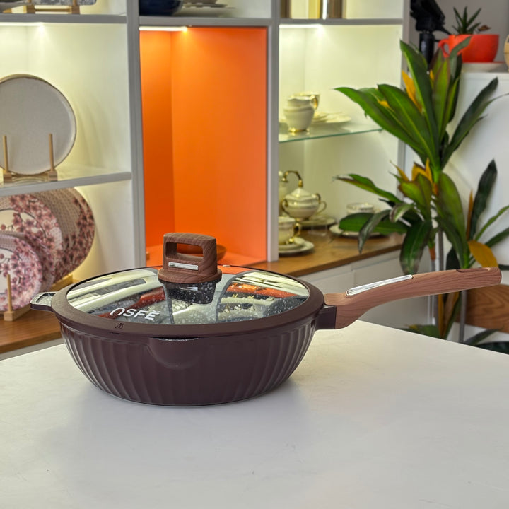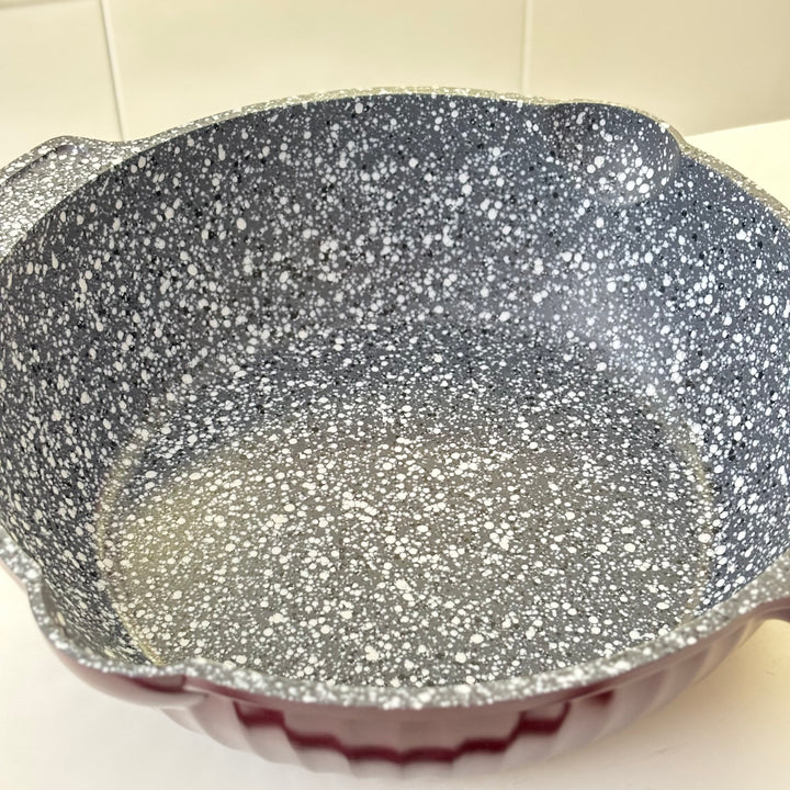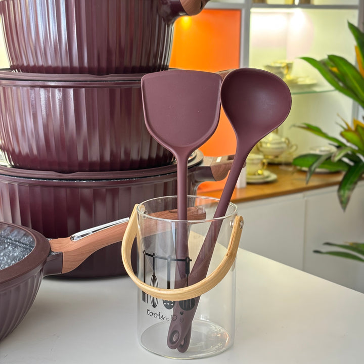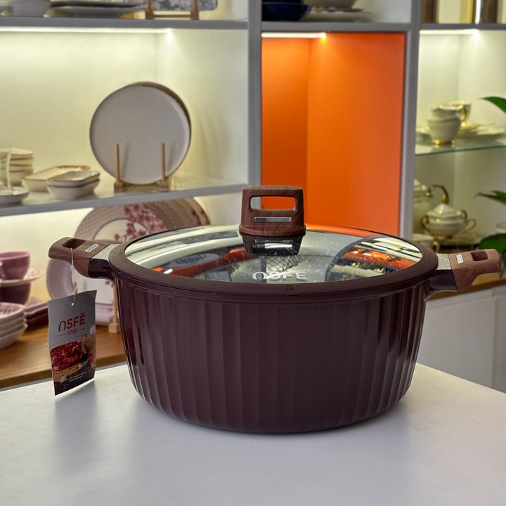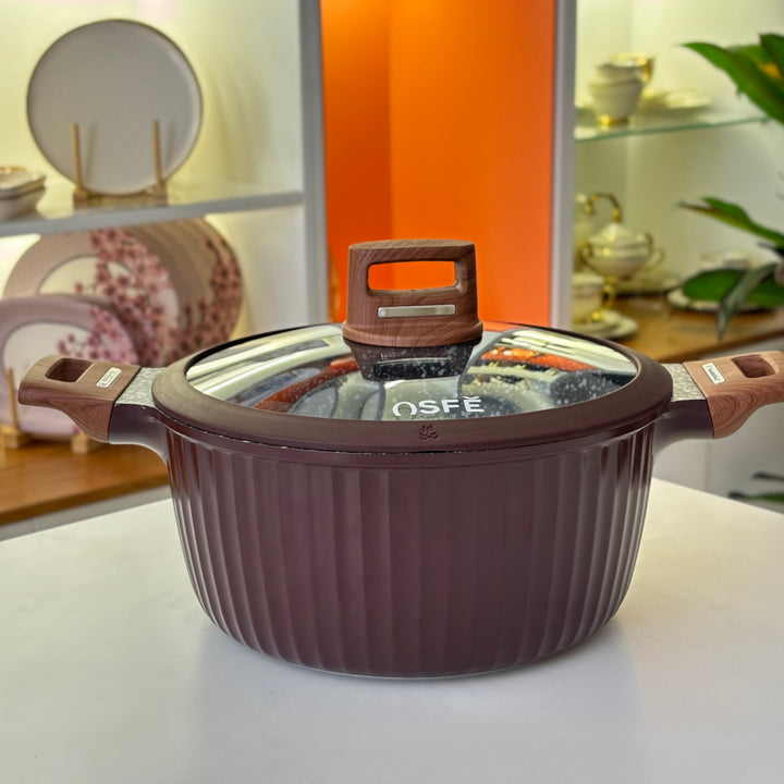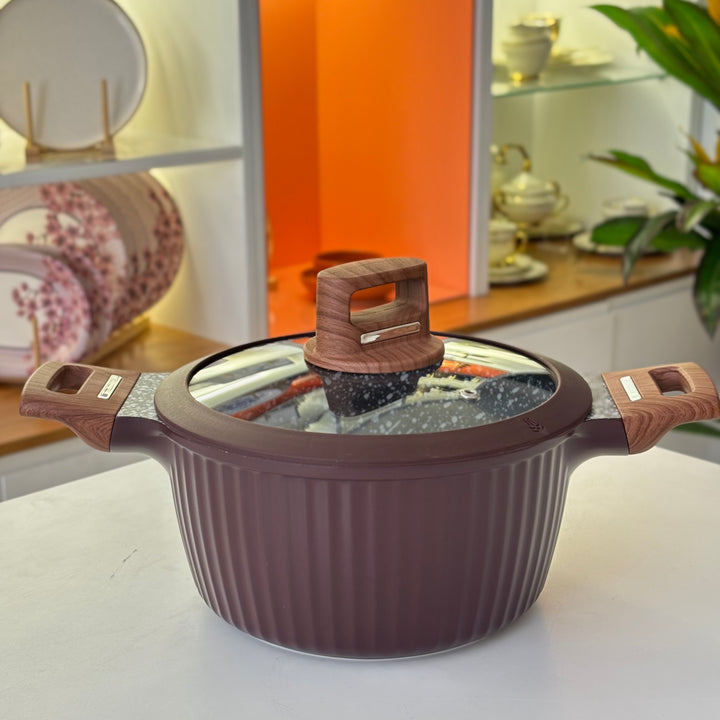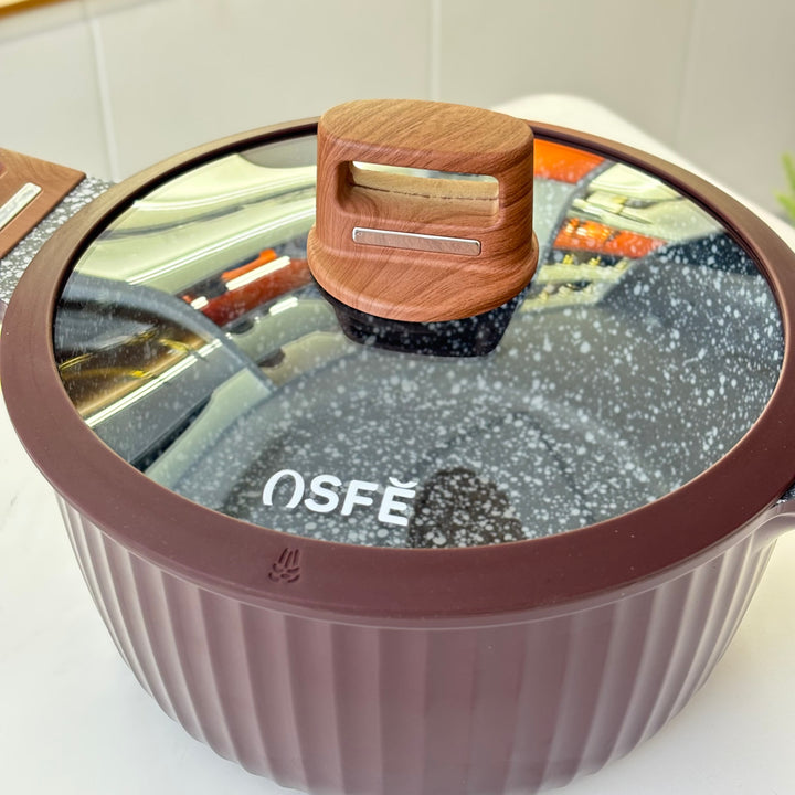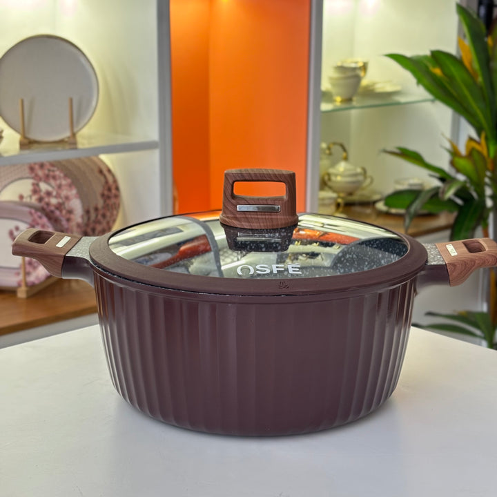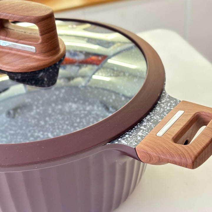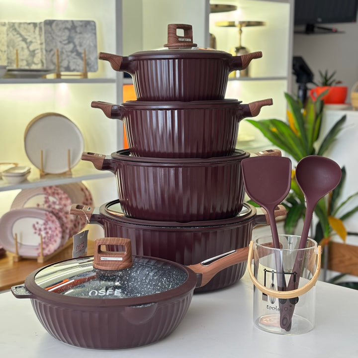 طقم طناجر جرانيت باللون الخمري 12 قطعه مع هدية طقم كفاكير 5 قطع ذهبي
