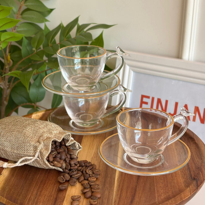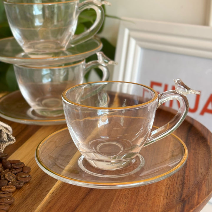 طقم 6 فناجين 6 صحون قهوة شفاف مع حواف ذهبي والعصفور ع اليد بجودة عالمية