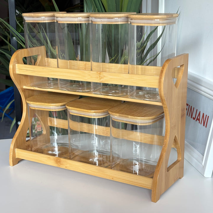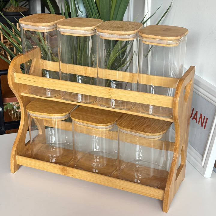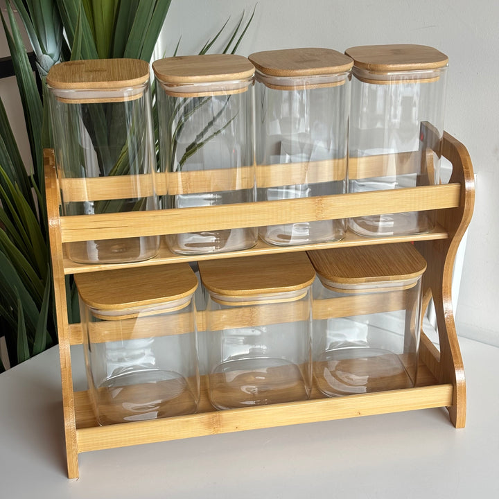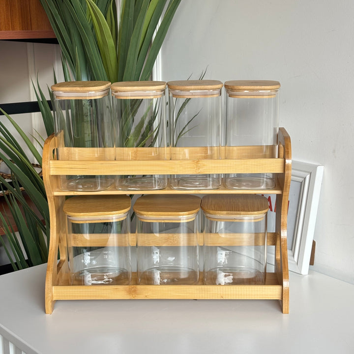 طقم 7 مرتبانات زجاج غطاء خشب بامبو ضغط وستاند خشب بامبو